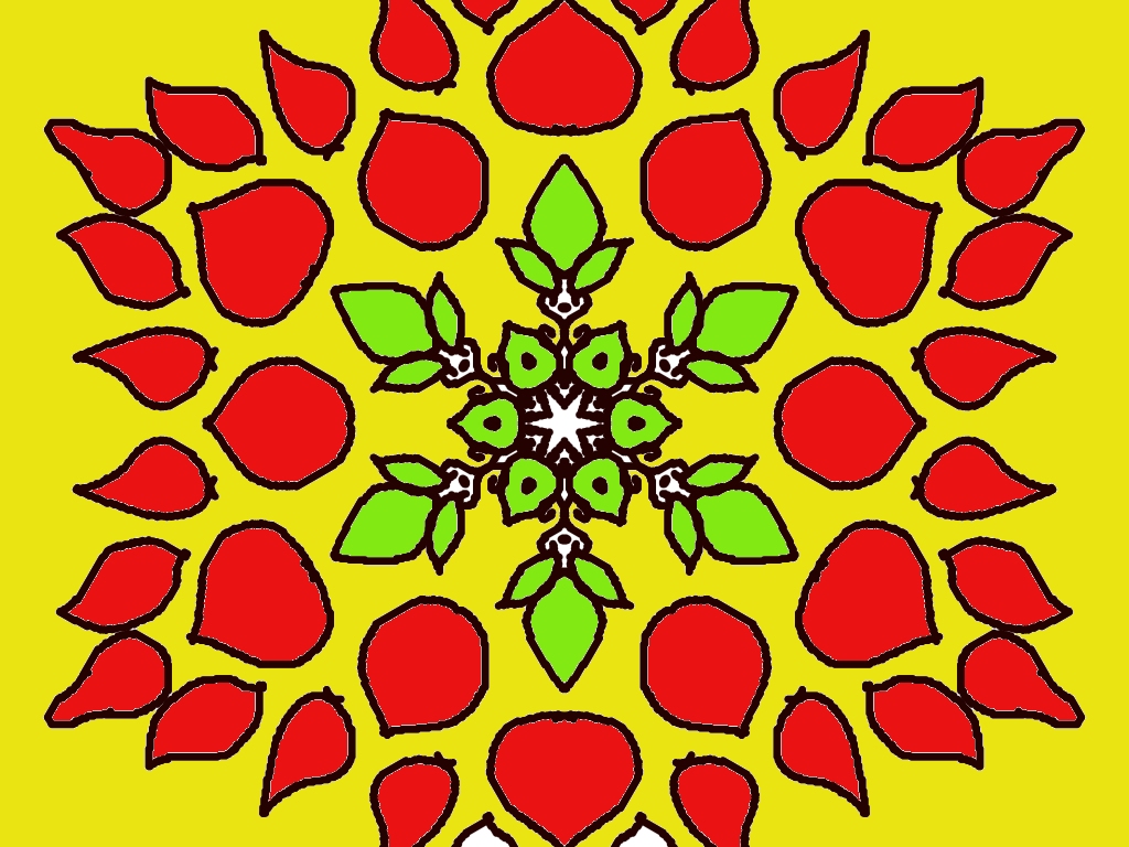 This rangoli design features a bright and vibrant color palette with a yellow background that makes the entire pattern glow. At the center, there is a circular arrangement of small green leaves and buds, forming a symmetrical floral core. Surrounding this inner circle are layers of large red petal shapes, each outlined with a bold black stroke. These red petals radiate outward in repeating clusters, creating a striking mandala-like effect. Between the red layers, additional green leaves appear near the center, adding contrast and balance. The overall design is highly symmetrical, colorful, and full of festive energy.